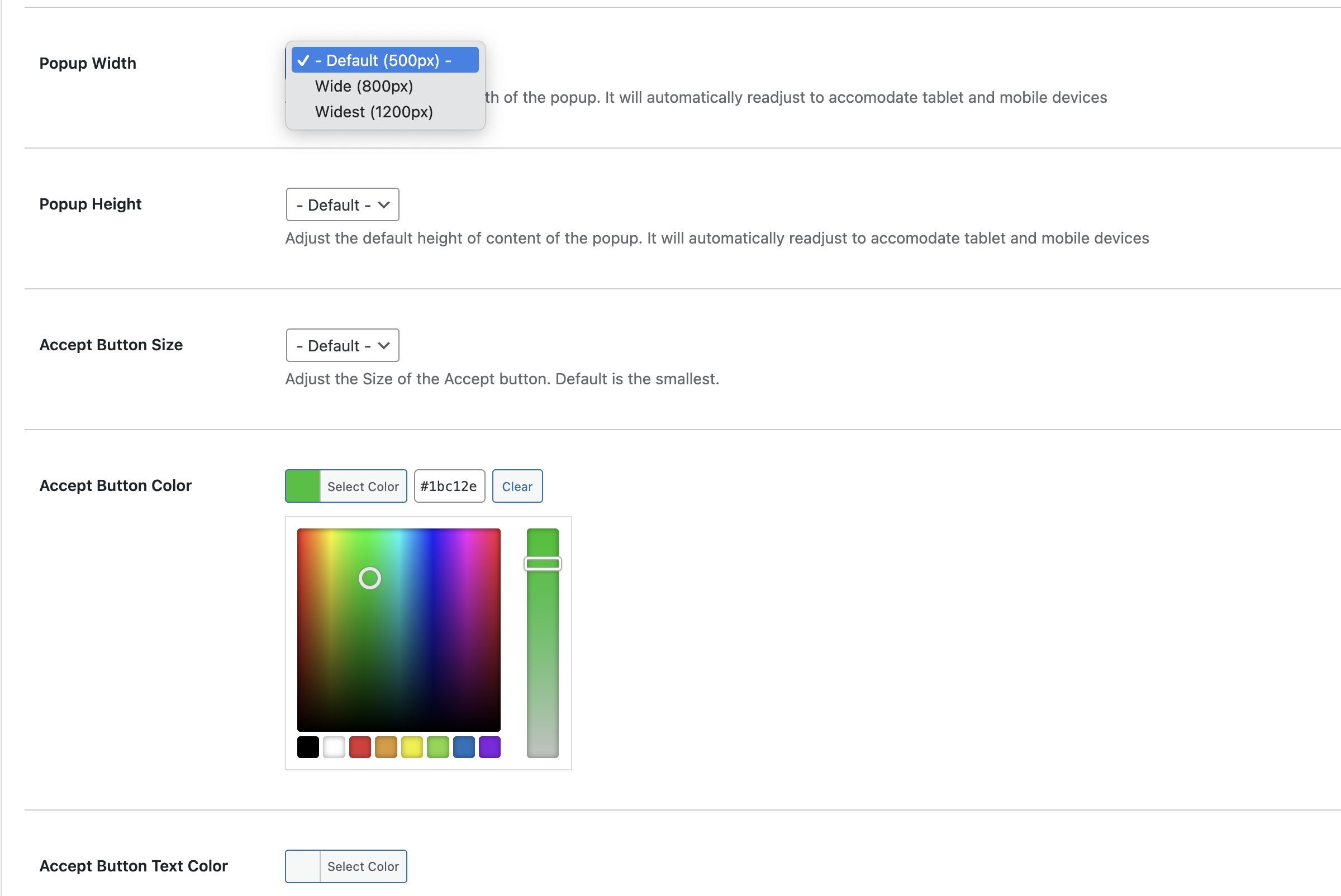 - Easily customize the size of the popup, the labels in the popup as well as the size and color of buttons.
