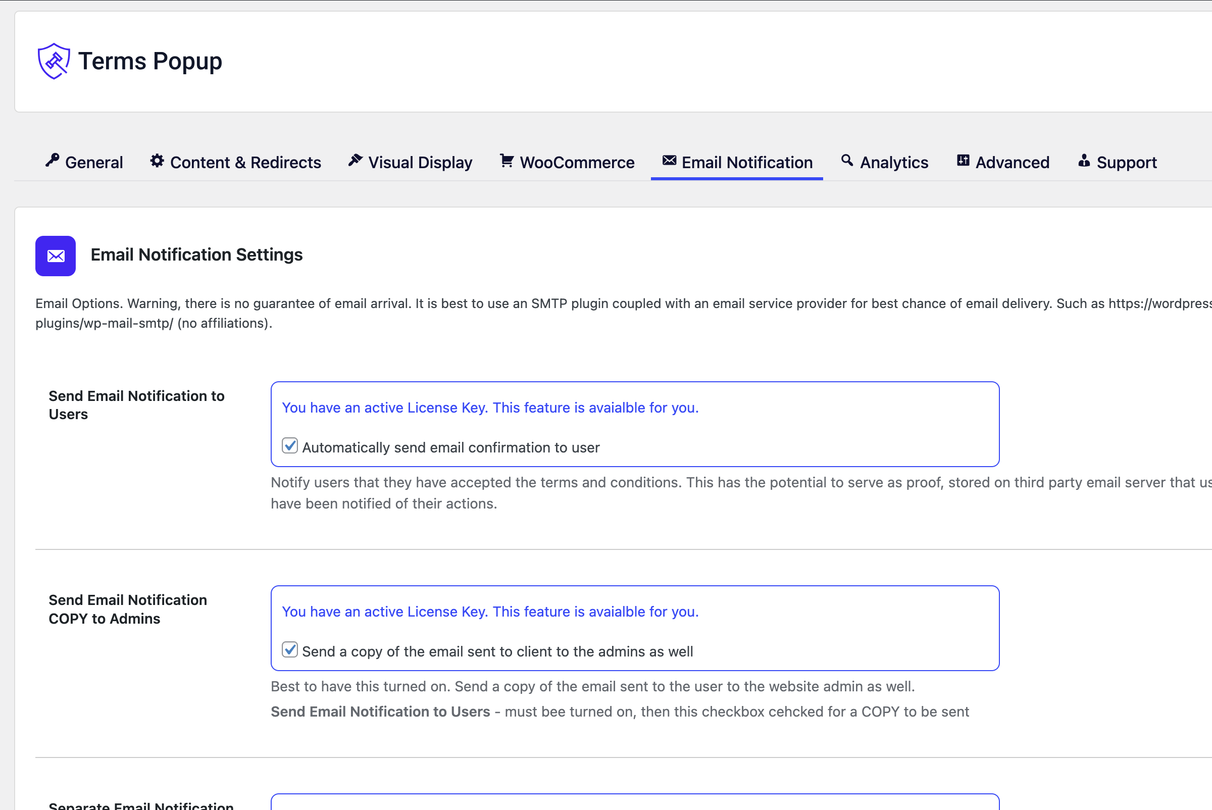 - Custom email receipts of acceptance are sent to both admins and users as legally verifiable proof of consent. These receipts include all necessary details to act as a third-party record of the action taken (premium only).